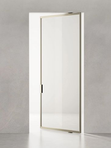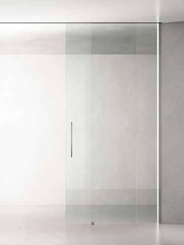 An invisible pivot hinge, hidden within the perimeter profile and which can be placed either at the center or to the side, allows the door to rotate on its axis.